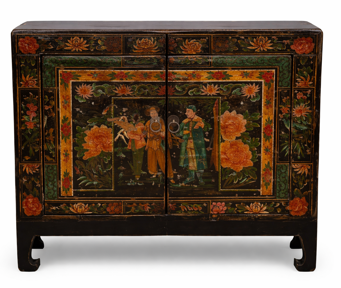 Antikes Chinesisches Sideboard Schwarz Rot Pfingstrosen Handbemalt B167xT40xH87cm