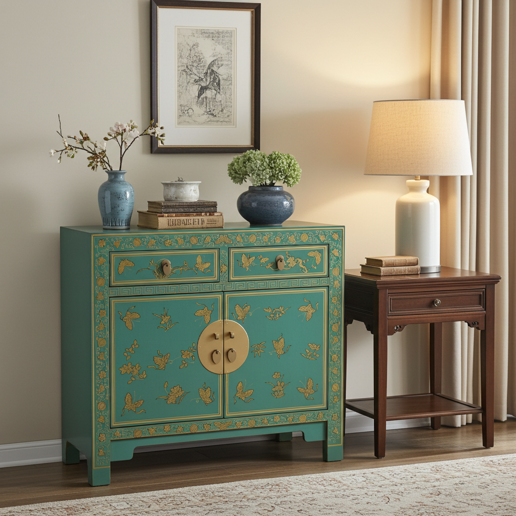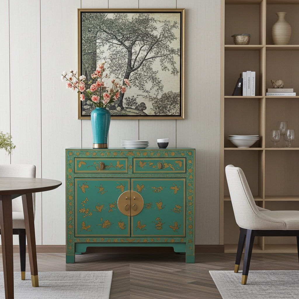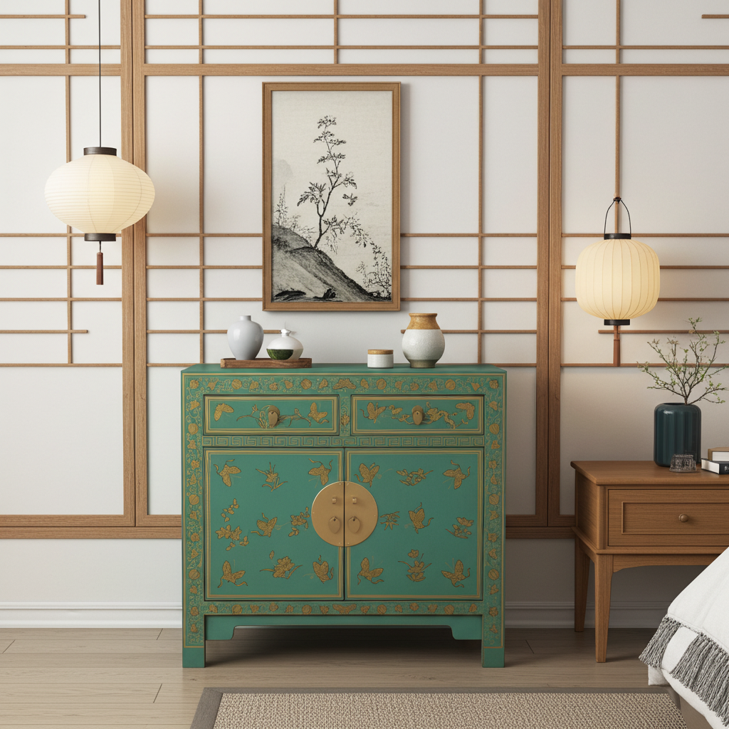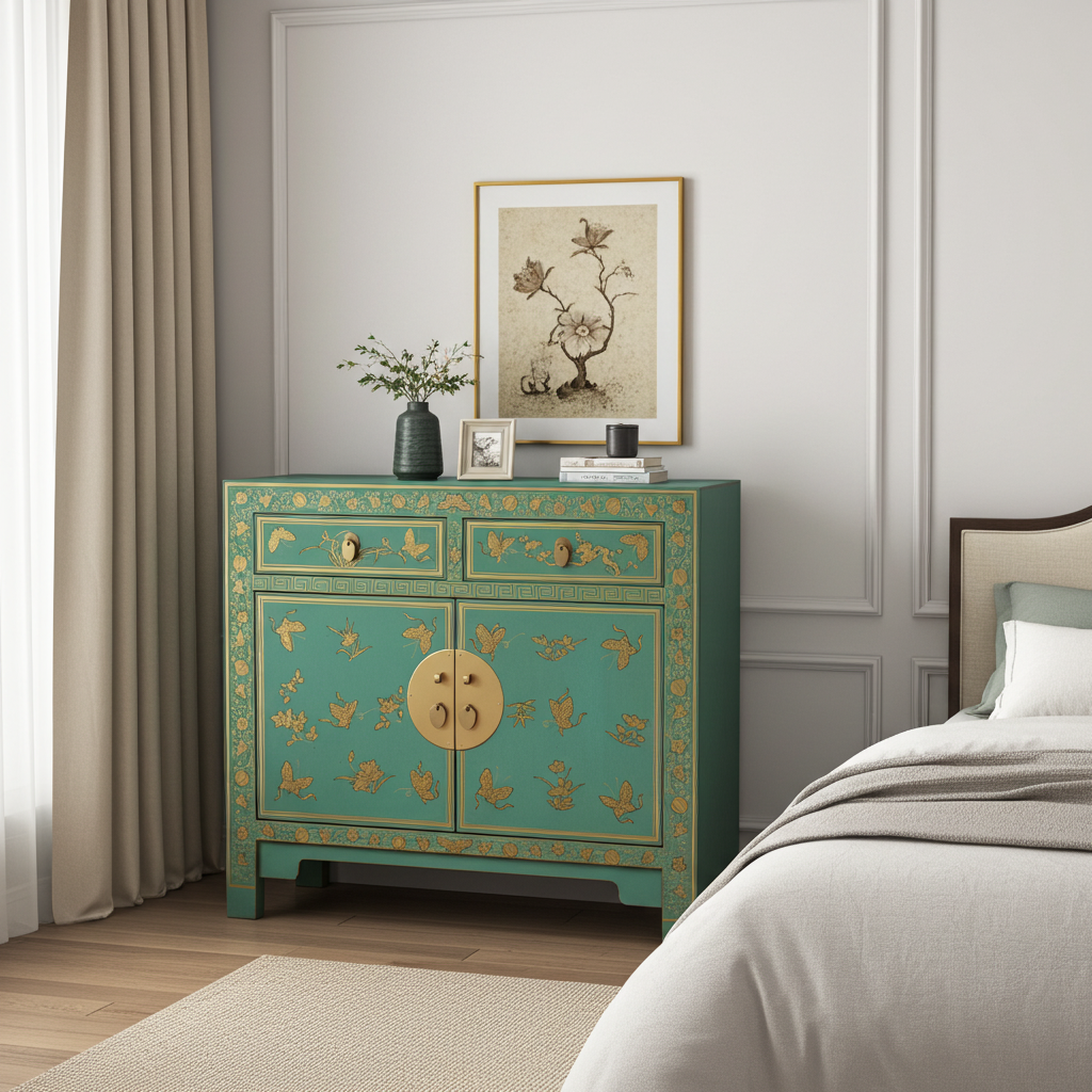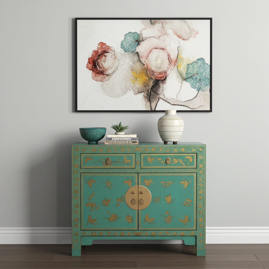 Chinesischer Schrank Dusty Turquoise Schmetterlinge Handbemalt - Orientique Kollektion B90xT40xH80cm