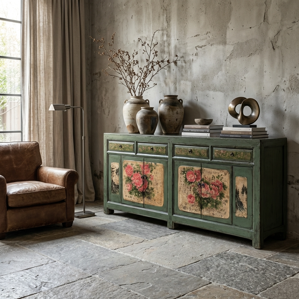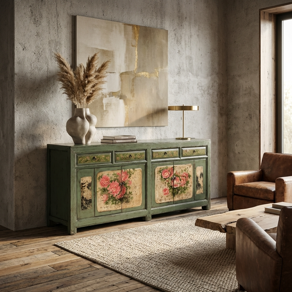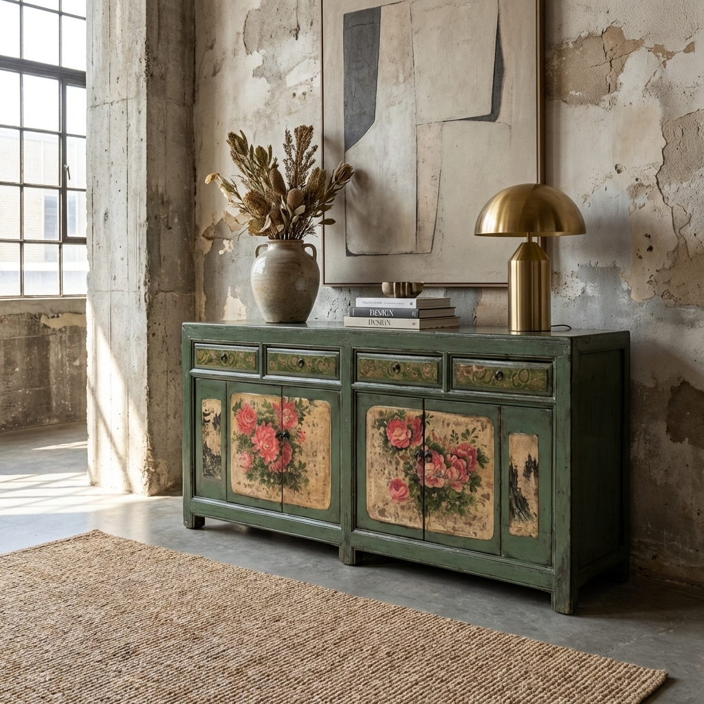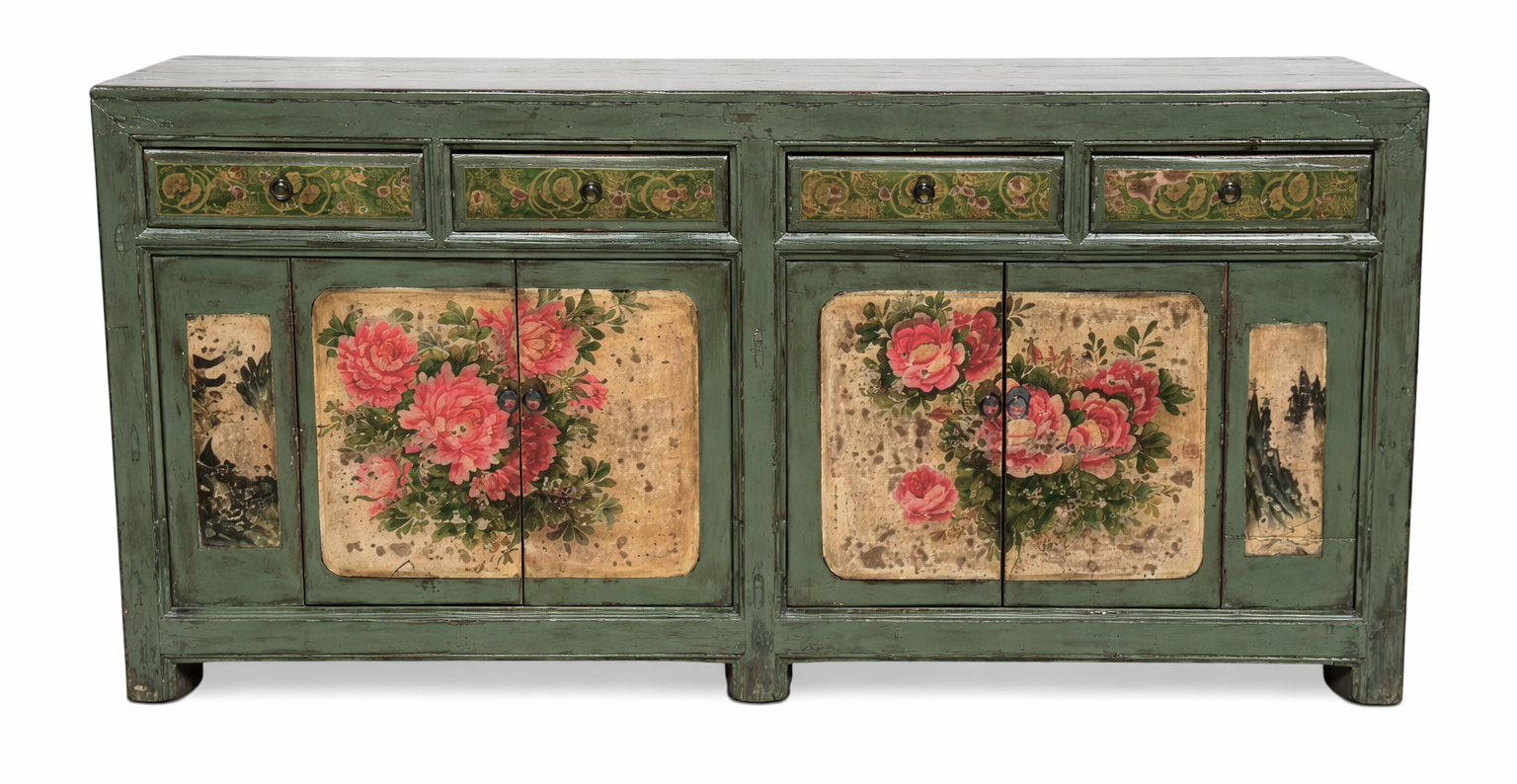 Aparador Chino Antiguo Menta con Peonías Pintadas a Mano An203xP43xAlt84cm