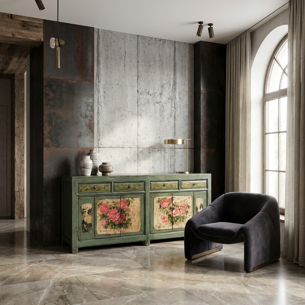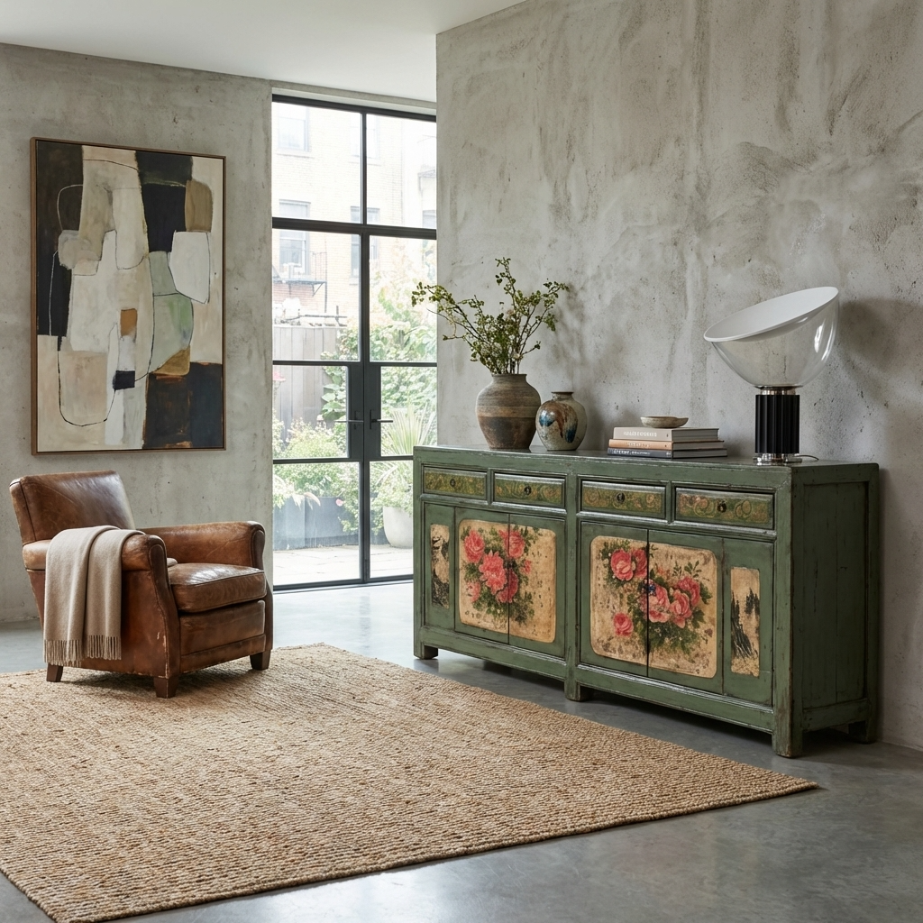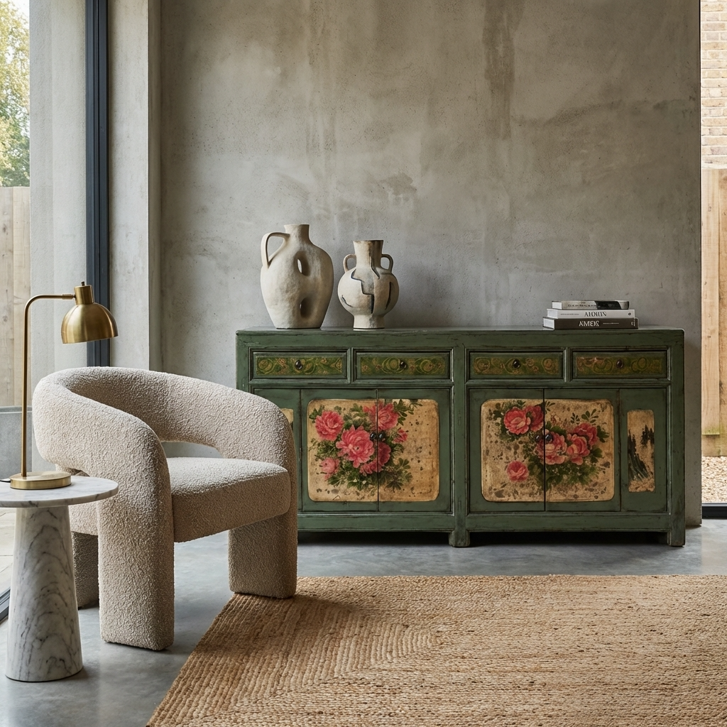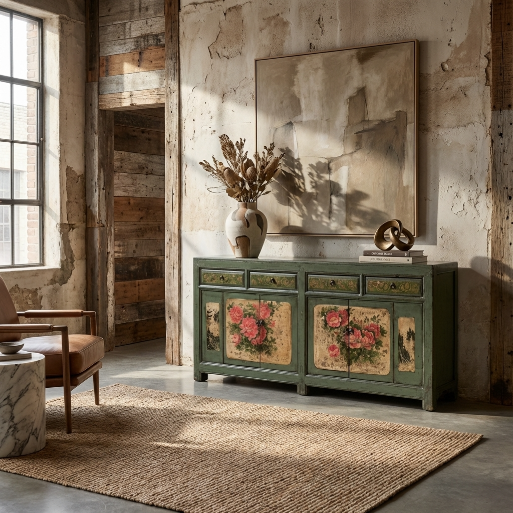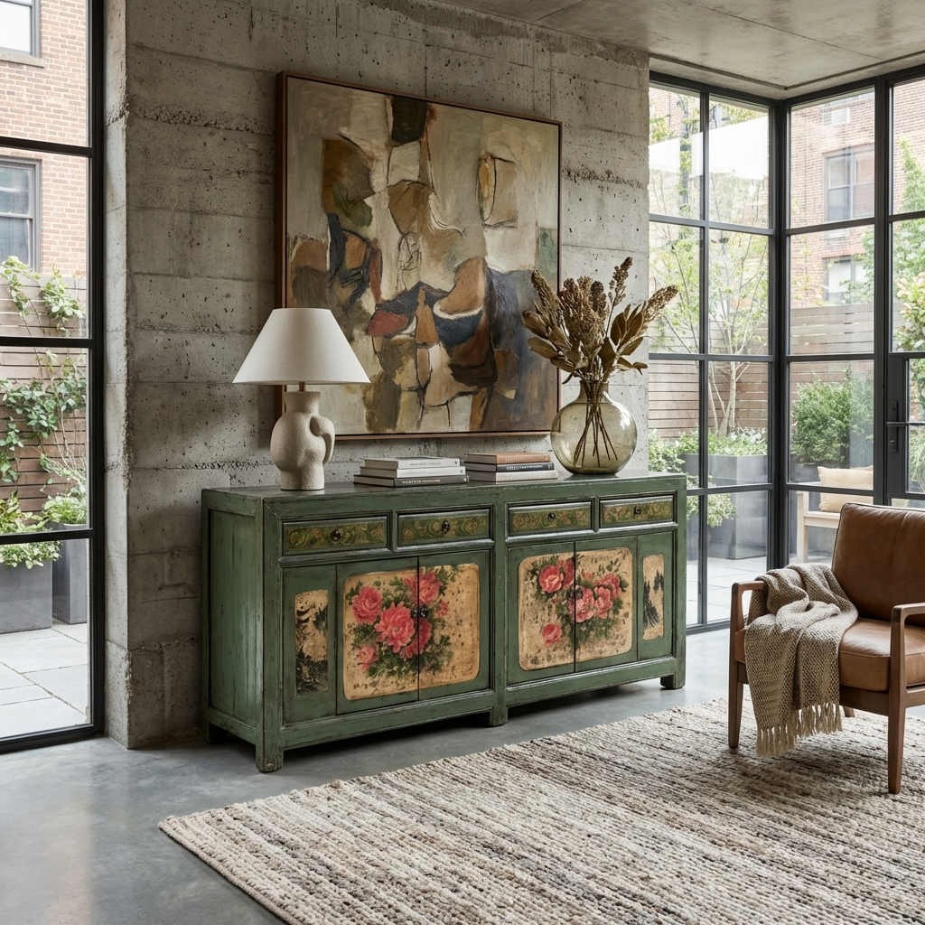 Aparador Chino Antiguo Menta con Peonías Pintadas a Mano An203xP43xAlt84cm