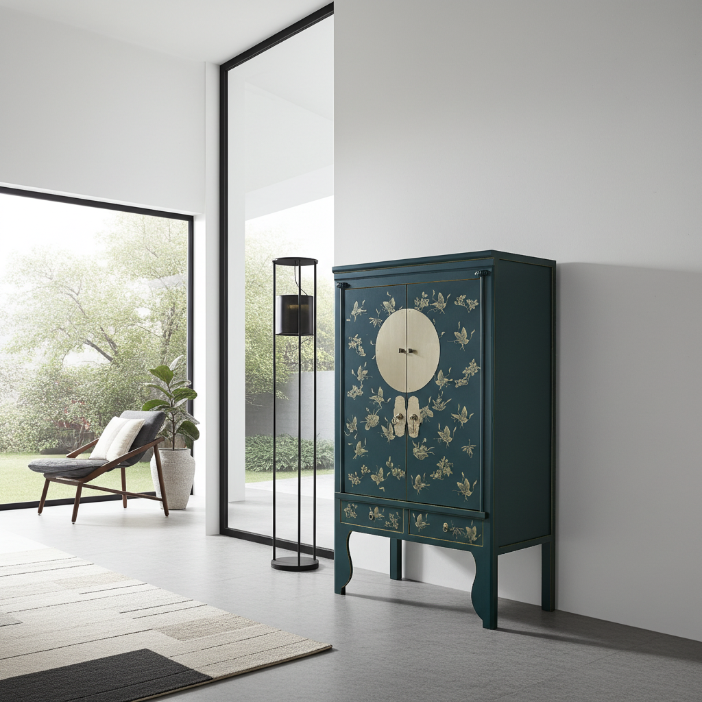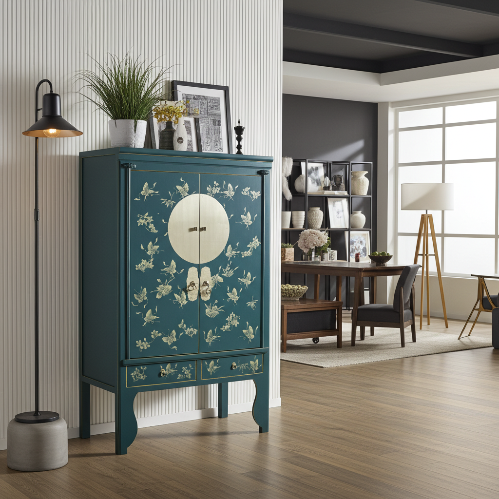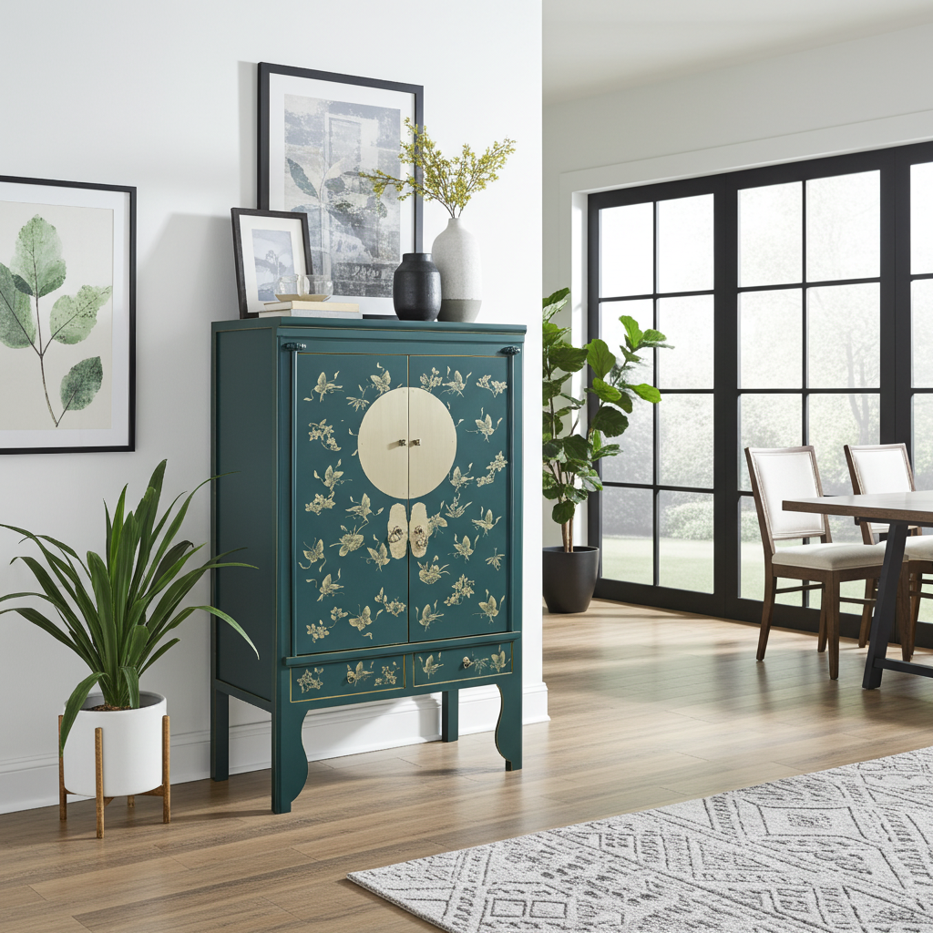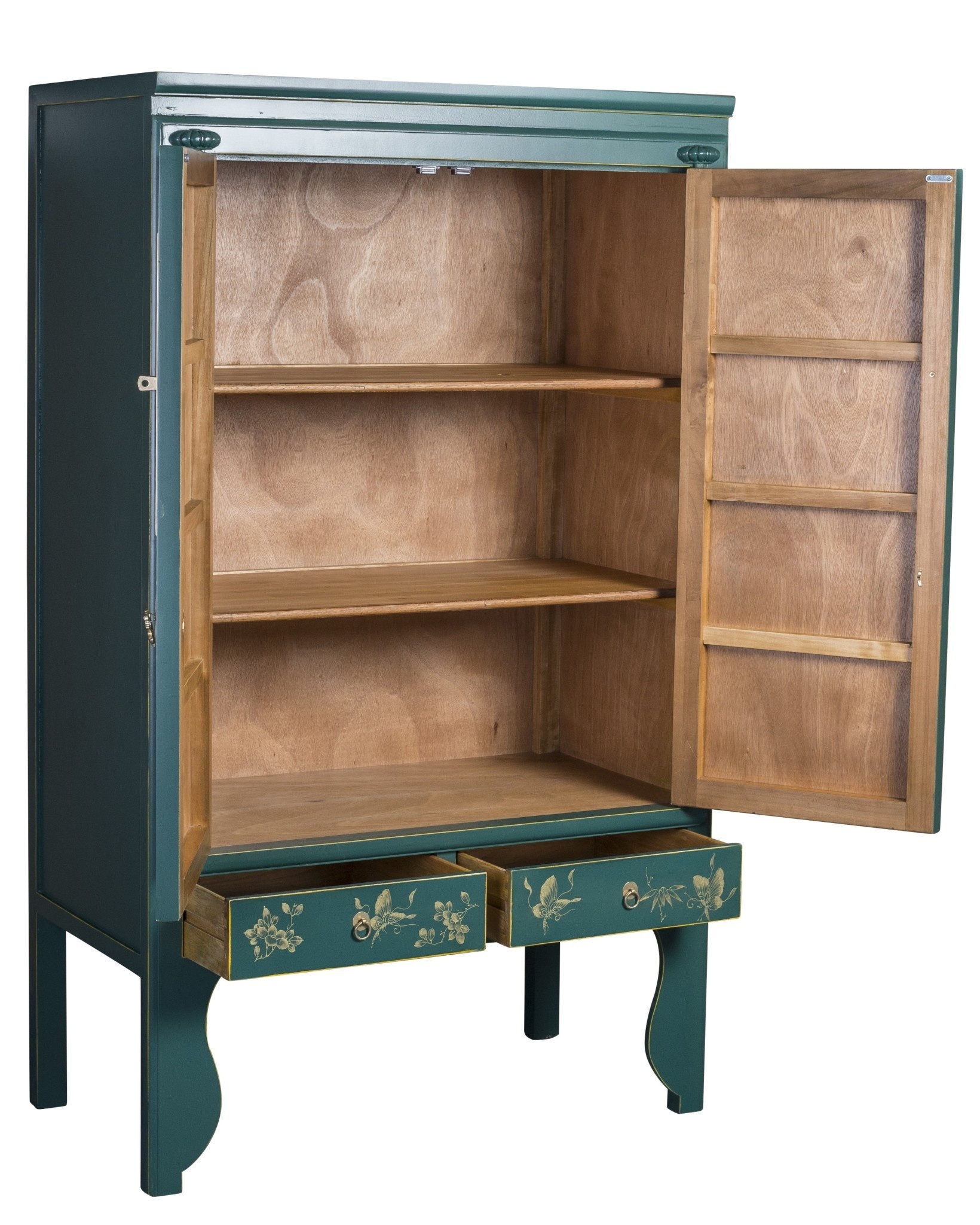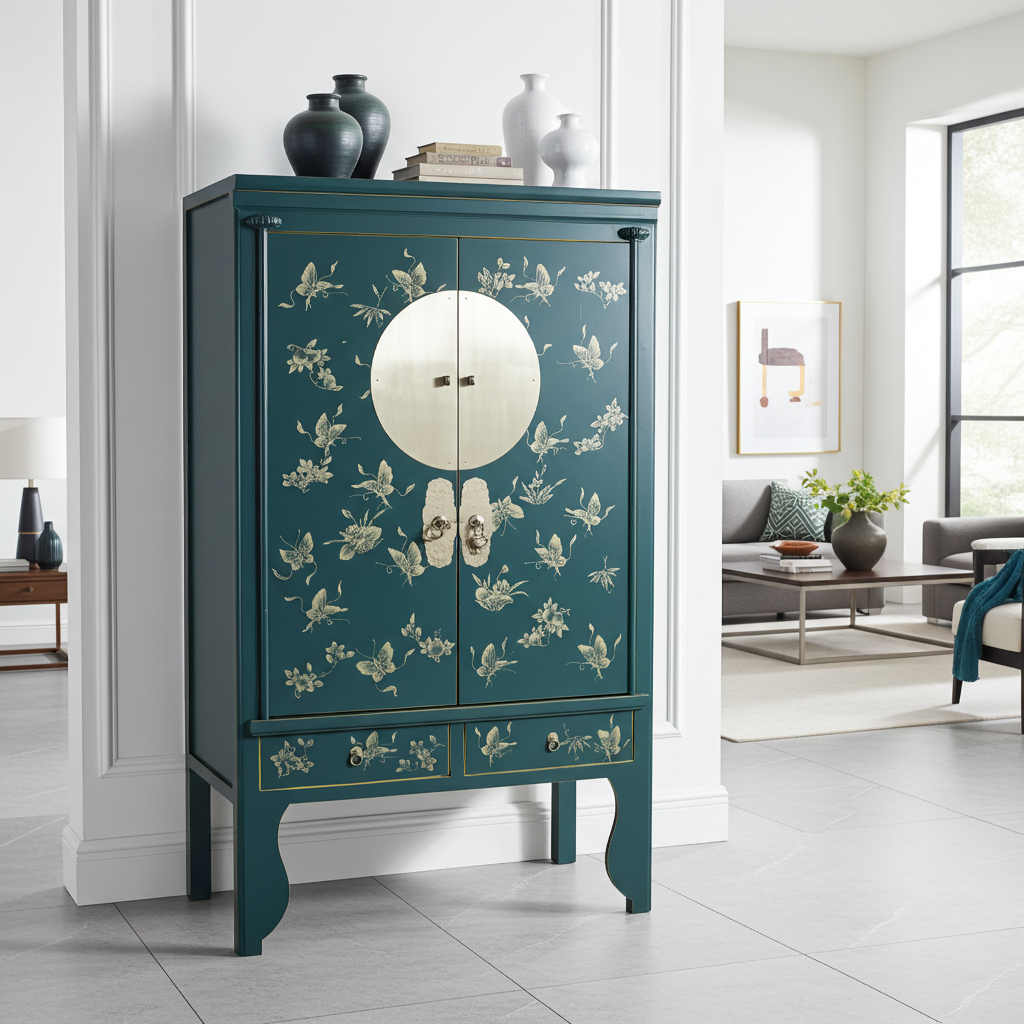 Armoire de Mariage Chinoise Peinte à la Main Papillons Teal - Collection Orientique L100xP55xH175cm