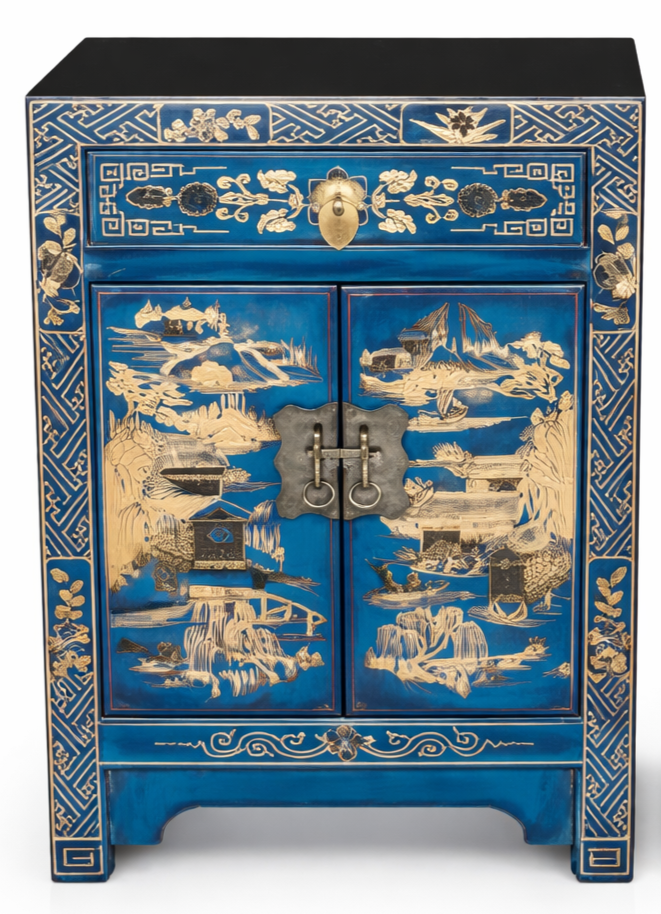 Articles récentsAfficher le produitTable de Chevet Chinoise Bleue Peinte à la Main avec Scène de Village L40xP32xH60cm€425,00