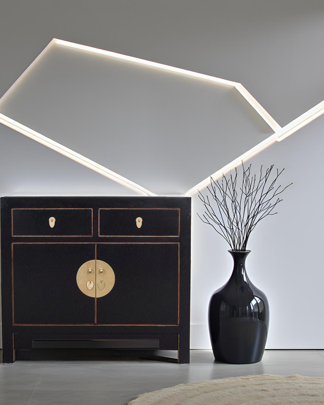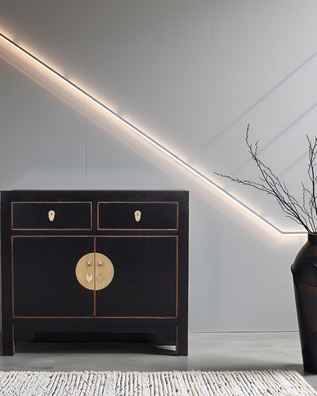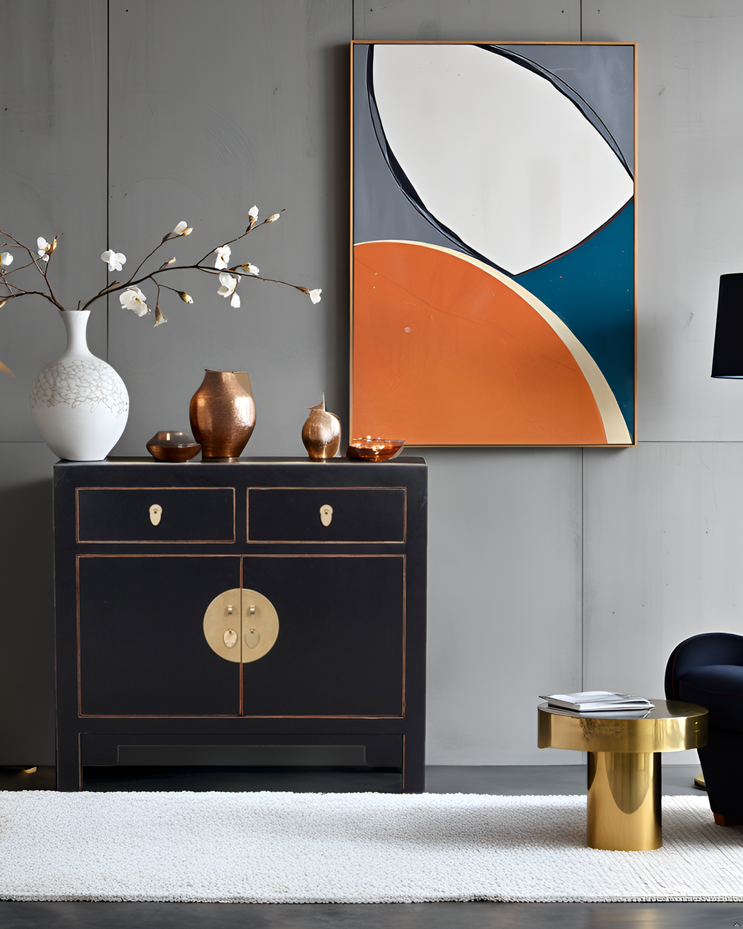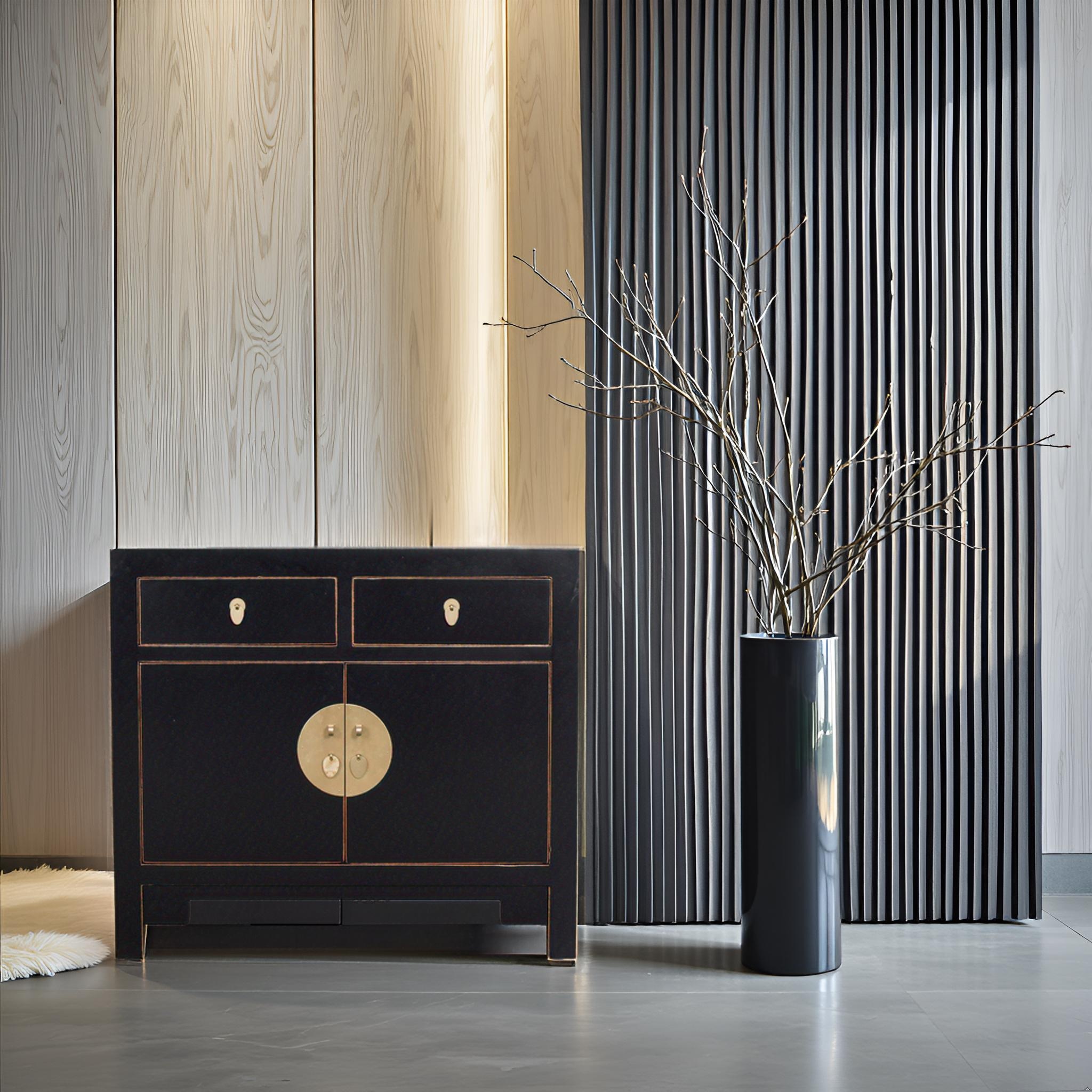 Nella tradizione cinese, il colore onice nero simboleggia l'acqua come uno degli cinque elementi ed è associato al Nord e alla stagione invernale. Rappresenta il mistero e la potenza, ma anche l'eleganza e la formalità. Questo armadio di stoccaggio orientale dispone di due cassetti e spazio di archiviazione dietro due porte. Le maniglie rotonde simboleggiano completezza e abbondanza. Lo sfondo rotondo in bronzo sulla porta, combinato con la forma quadrata, rappresenta il concetto filosofico tradizionale cinese di Tian Yuan Di Fang (cielo rotondo e terra quadrata).